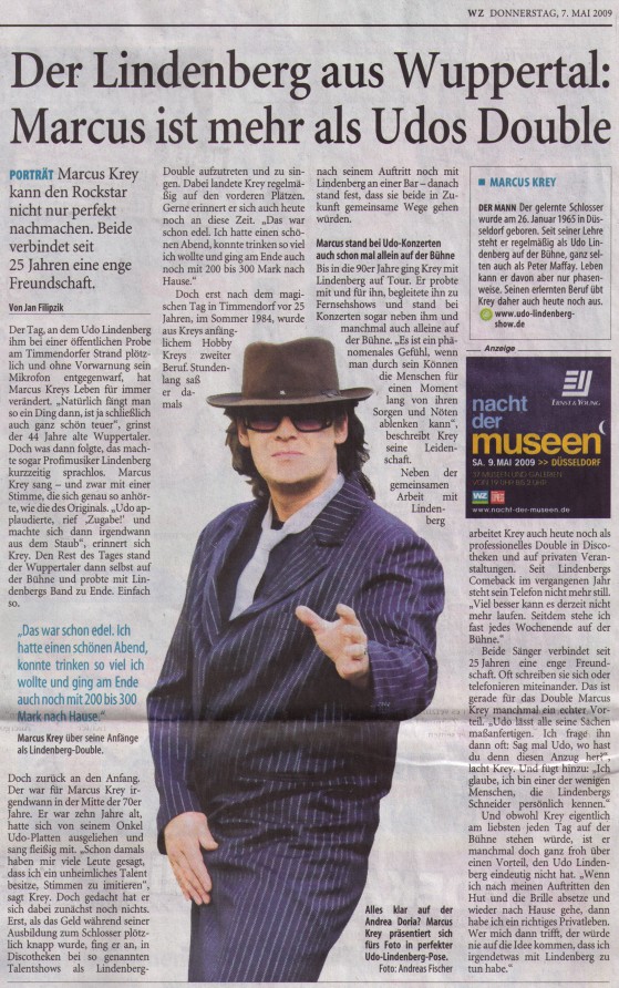 Doch zurück an den Anfang. Der war für Marcus Krey irgendwann in der Mitte der 70er Jahre. Er war zehn Jahre alt, hatte sich von seinem Onkel Udo-Platten ausgeliehen und sang fleißig mit. „Schon damals haben mir viele Leute gesagt, dass ich ein unheimliches Talent besitze, Stimmen zu Imitieren”, sagt Krey. Doch gedacht hat er sich dabei zunächst noch nichts. Erst, als das Geld während seiner Ausbildung zum Schlosser plötzlich knapp wurde, fing er an, in Discotheken bei so genannten Talentshows als Lindenberg-Double aufzutreten und zu singen. Dabei landete Krey regelmäßig auf den vorderen Plätzen. Gerne erinnert er sich auch heute noch an diese Zeit. „Das was schon edel. Ich hatte einen schönen Abend, konnte trinken so viel ich wollte und ging am Ende auch noch mit 200 bis 300 Mark nach Hause.”