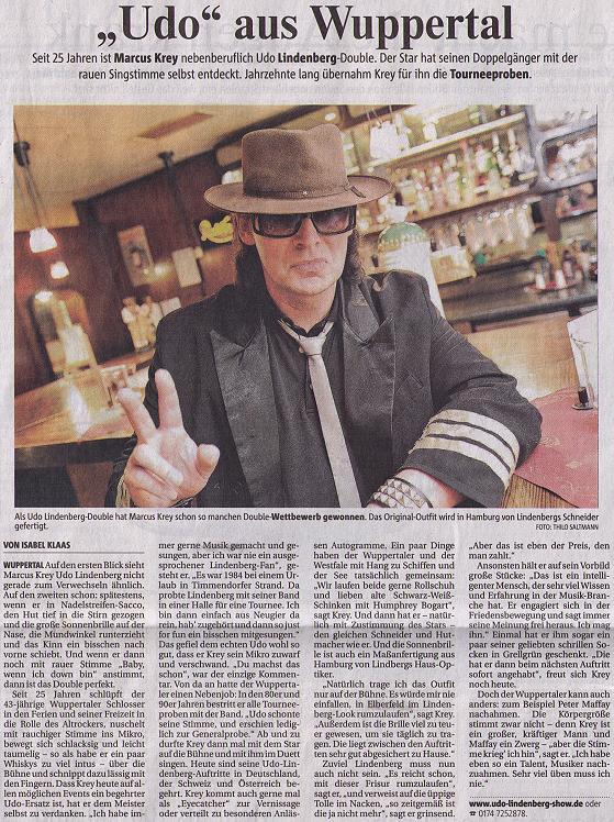 Seit 25 Jahren schlüpft der 43-jährige Wuppertaler Schlosser in den Ferien und seiner Freizeit in die Rolle des Altrockers, nuschelt mit rauchiger Stimme ins Mikro, bewegt sich schlacksig und leicht taumelig – so als habe er ein paar Whiskys zu viel intus – über die Bühne und schnippt dazu lässig mit den Fingern. Dass Krey heute auf allen möglichen Events ein begehrter Udo-Ersatz ist, hat er dem Meister selbst zu verdanken. „Ich habe immer gerne Musik gemacht und gesungen, aber ich war nie ein ausgesprochener Lindenberg-Fan”, gesteht er. „Es war 1984 bei einem Urlaub in Timmendorfer Strand. Da probte Lindenberg mit seiner Band in einer Halle für eine Tournee. Ich bin dann einfach aus Neugier da rein, hab' zugehört und dann so just for fun ein bisschen mitgesungen.” Das gefiel dem echten Udo wohl so gut, dass er Krey sein Mikro zuwarf und verschwand. „Du machst das schon”, war der einzige Kommentar. Von da an hatte der Wuppertaler einen Nebenjob: In den 80er und 90er Jahren bestritt er alle Tourneeproben mit der Band. „Udo schonte seine Stimme, und erschien lediglich zur Generalprobe.” Ab und zu durfte Krey dann mal mit dem Star auf die Bühne und mit ihm im Duett singen. Heute sind seine Udo-Lindenberg-Auftritte in Deutschland, der Schweiz und Österreich begehrt. Krey kommt auch gerne mal als „Eyecatcher” zur Vernissage oder verteilt zu besonderen Anlässen Autogramme. Ein paar Dinge haben der Wuppertaler und der Westfale mit Hang zu Schiffen und der See tatsächlich gemeinsam: „Wir laufen beide gerne Rollschuh und lieben alte Schwarz-Weiss-Schinken mit Humphrey Bogart”, sagt Krey. Und dann hat er – natürlich mit Zustimmung des Stars ” den gleichen Schneider und Hutmacher wie er. Und die Sonnenbrille ist eine Maßanfertigung aus Hamburg von Lindenbergs Haus-Optiker.